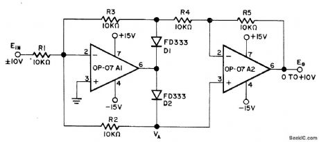 Circuit using two Precision Monolithics OP-07 opamps provides precise full-wave rectification by inverting negative-polarity input voltages and operating as unity-gain buff er for positive-polarity inputs. Applications include positive-peak detectors, single-quadrant multipliers, and magnitude-only measuring systems. For positive inputs, circuit simply operates as two unity-gain amplifier stages. Negative input turns D1 off and D2 on, changing resistor currents precisely enough to give overall circuit gain of -1. Design equations are given.-D. Soderquist and G. Erdi, The OP-07 Ultra-Low Offset Voltage Op Amp-a Bipolar Op Amp That Challenges Choppers, Eliminates Nulling, Precision Monolithics, Santa Clara, CA, 1975, AN-13, p 10. (View)