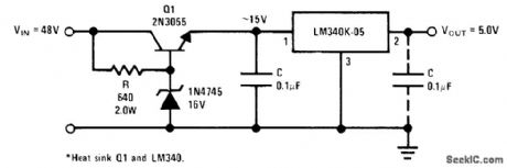 Combillation of zener and resistor R gives equivalent of power zener as solution to regulator protection problem when input voltage is much higher than rated maximum of regulator. Maximum load is 1A. With optional capacitor,circuit noise is only 700μV P-P.-″Linear Applications、Vol.2、″ National Semiconductor,Santa Clara,CA、1976、AN-103,p 10. (View)