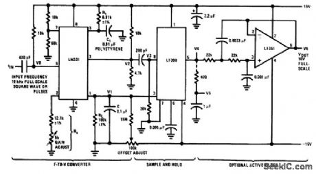 Fig, 12-20 This circuit uses both a sample/hold and an active filter to minimize the ripple/response tradeoff. With the values shown, ripple (at V6) is about 1 mVp-p. Response or settling time to a step change of input frequency is about 60 ms. Linearity is better than 0.1% from 10 kHz down to 500 Hz, but becomes increasingly nonlinear below 500 Hz. To trim, apply 1 kHz and set the offset adjust for 1-V output. Then, apply 10 kHz and set the gain adjust for 10-V Output. National Semiconductor. Linear Applications Handbook 1991,p 1253. (View)
