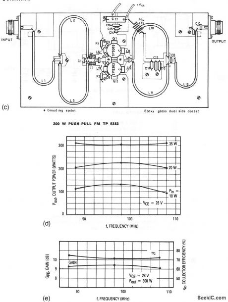 This circuit has a galn of about 9 dB over the frequency range.Thecomponents list,component layout,output power Versus input power and frequency, and gain are shown in Figs. 2-57B, 2-57C, 2-57D, and 2-57E, respectively. The actual layout dimensions are: 4.25 × 2.25 . (View)