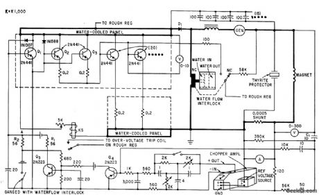 Used in double-loop servo system that holds field of Large electromagnet constant to one part in 15,000,000. Primary loop or rough regulator establishes small region over which fine regulator operates. Uses 20 paralleled transistors in output stage to regulate by dissipating some of available power.-A. M. Patlach, Precision Servo Regulator Controls High-Power Magnetic Field, Electronics, 33:45, p 66-69. (View)