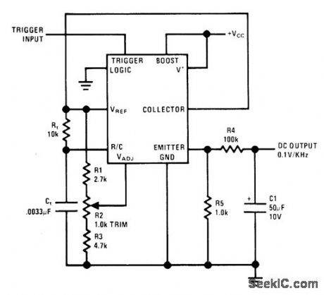 National LM122 timer is used as tachometer by averaging output pulses with simple filter.Pulse width is ad justed with R2 to provideinitialcalibration at 10 kHz. Linearity is about 0.2% foroutput range of 0-1 V. Analog metercan be driven directly by connecting it in series with R5.Supply can range from 4.5 to 40 V.-C. Nelson, Versatile Timer Operates from Microsecondsto Hours, National Semiconductor, Santa Clara, CA, 1973, AN-97, p 10. (View)