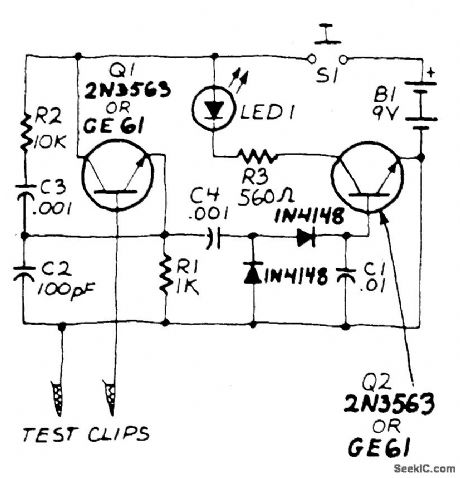 Transistor Q1, a 2N3563, and its associated components form an oscillator circuit that will oscillate if, and only if, a good crystal is connected to the test clips. The output from the oscillator is then rectified by the two 1N4148 diodes and filtered by C1, a.01 μF capacitor.The positive voltage developed across the ca-pacitor is applied to the base of Q2, another 2N3563, causing it to conduct. When that happens, current flows through LED1, causing it to glow. Since only a good crystal will oscillate, a glowing LED indicates that the crystal is indeed Ok. The circuit is powered by a standard nine-volt transistor-radio battery and the SPST pushbutton power-switch is included to prolong battery life. (View)