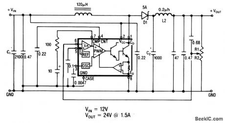 The SLM switching-regulator ICs contain most elements necessary for converter operation, as shown in Fig. 4-2C. Figure 4-2B shows the output voltage and characteristics for various part numbers. Figure 4-2D shows the absolute maximum ratings. Simply add a choke, catch diode, and two capacitors to the IC for a complete converter. (View)