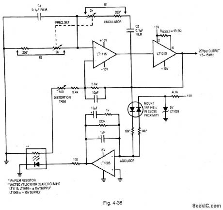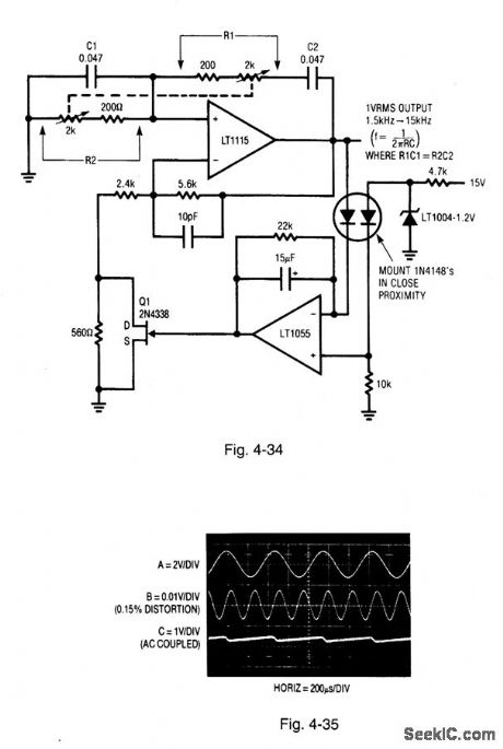Figure 4-34 shows a sine-wave oscillator that uses electronic stabilization in place of the lamp. Figure 4-35 shows the waveforms. Trace A shows the output. Trace B shows distortion, and trace C shows the rectifier peaking residue at the Q1 gate. LINEAR TECHNOLOGY, APPLICATION NOTE 43, P. 30, 31. (View)