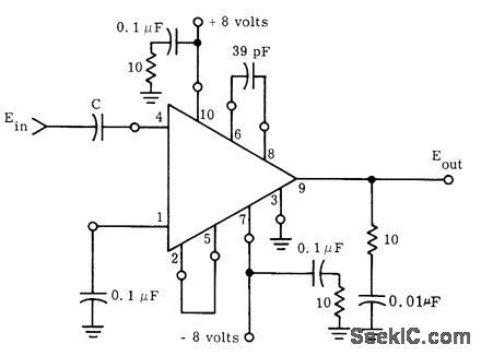 Uses Motorola MC1554 power amplifier to provide voltage gain of 35 with componentsshown. Output voltageswing is 12 V P-P into 12-ohm load. For responsedown to low audio frequencies (below 100 Hz), large value of C is required, such as 1μF. Input can be direct-coupled at sacrifice in output offset, but this can be corrected by properly biasing pin 1 or terminating it in about 250 ohms. Upper fre-quency limit for -3 dB is about 22,000 Hz.-' The MC1554 One-Watt Monolithic Integrated Circuit Power Amplifier, Motorola, Phoenix, AZ, 1972, AN.401, p 3. (View)