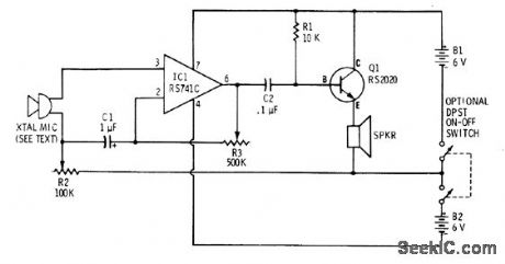High Inputimpedance of RS741C opamp permits use withany general-purpose crystal microphone R2 is volume control,and R3 controls gain and frequency response of IC Power transistor stagedrives loudspeaker directly without outputtransformer、-F M、Mims,″Integrated Circuit Proiects、vol,6、″Radio Shack,Fort Worth,TX,'1977 p 79-88 (View)