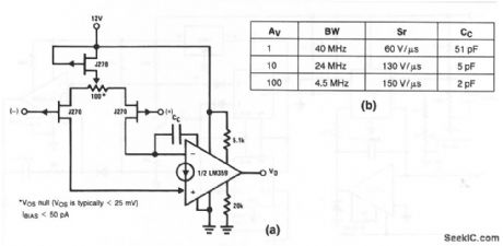 This circuit combines a Norton with a P-channel JFET to procDuce.a fast op amp. External compensation capacitance CC is required to accommodate u any additional phase shift at the input. Figure 11-21B shows circuit performance for various values of CC. (View)
