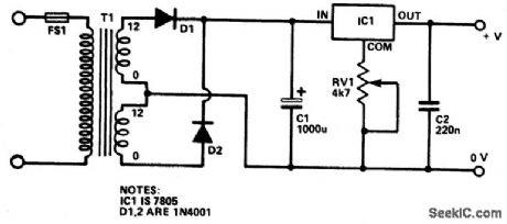 This circuit gives a regulated output of between 5 V and 15 Vdc, adjusted and set by a preset resistor. Current output up to about 350 mA. An integrated circuit regulates the output voltage and although this IC (the 7805) is normally used in a fixed-voltage (5 Vdc) supply it is for a variable output voltage. (View)
