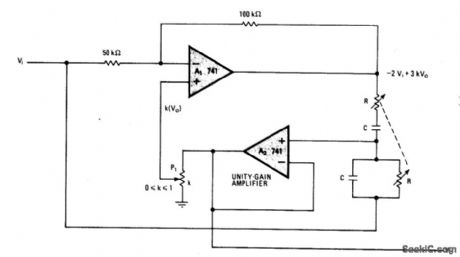 This notch filter, which operates at up to 200 kHz, uses a modified Wien bridge to select bandwidth over which frequencies are rejected. RC components determine filter's center frequency, Plselects notch bandwidth. Notch depth is fixed at about 60 dB. (View)