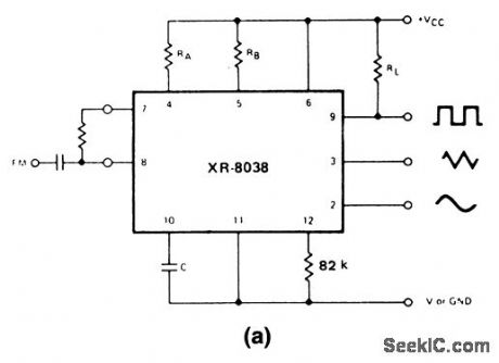 These circuits are similar to that of Fig. 5-47, except that the circuits provide for FM or sweep modulation. Use circuit 5-50A for FM (small deviations, about±10%). Use circuit 5-50B for a sweep range of 1000:1. As a guideline, the sweep frequency approaches 0 Hz when the voltage at pin 8 equals VCC, and reaches maximum at the lower pin-8 voltage limit of VCC - (1/3 VSUPPLY -2).Waveform symmetry variations can be minimized when a 10-M resistor is added between pins 5 and 11. (View)