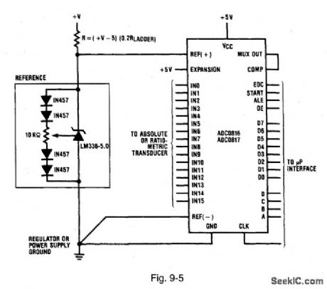 Figure 9-4 shows the ADC0816/17 connected for ratiometric conversion. Becauseboth ends of the 256R resistor ladder are available externally (Fig.9-1) the ICs areideally suited for use with ratiometric transducers A ratiometric transducer is aconverslon device in which the output is proportional to so me arbitrary full-scalevalue.The actual value of the transducer output is of no great importance but theratio of this output to the full-scale reference is valuable.The prime advantage of a ratiometric transducer is that an accurate reference is not essential However the reference should be nolse free because the voltage spikes during a converslon could cause inaccurate results.The circuit of Fig.9-4 uses the existing 5-V supply for reference thus eliminating the need for a special external reference. Take careto reduce power-supply nolse,The supply lines should be bypassed and separate PC traces shodld be used to route the 5-V and ground to the reference inputs andto the supply pms (if practical). NATIONAL SEMICONDUCTOR APPLICATION NOTE258 1994. P.592.