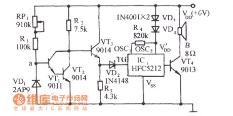 The circuit shown in FIG. It consists of a temperature sensor, temperature electronic switch circuit composed of sound and language. On hot summer season, PC's central processing unit CPU overheating often, the circuit VT1 die close to the CPU chip, radiator, once the CPU overheating, the circuit will issue a Notice that temperature cautioned statement, reminded officers to take measures to cool. (View)