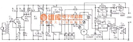 Circuit as shown, it includes acoustic sensor, audio amplifier, monostable trigger circuit, pulse counting/distribution circuit, thyristor speed regulation circuit, crickets sound circuit and ac step-down rectifier circuit, etc. Circuit using burst (such as punch, password) acoustic mode, three block wind speed can be control and stalling control, in the fan blowing at the same time, accompanied by filar silk cool meaning of crickets cry, strong anti-interference characteristics. (View)