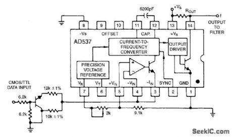 The AD537 is well-suited for frequency-shift modulator and demodulator applications. Requir-ing little power, it is especially appropriate for using phone-line power. The Bell-System 202 data en-coder shown here delivers the mark frequency of 1.2 kHz with the data input low. When the input goes high, the timing current increases to 165 μA and generates the space frequency of 2.2 kHz. The trim shown provides a ±10% range of frequency adjustment. The output goes to the required band-pass filter before transmission over a public telephone line. A complementary demodulator is easy to implement. (View)