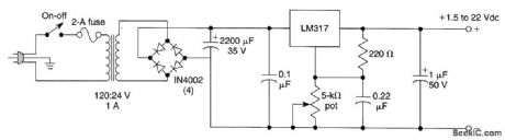 Using an LM317, this supply delivers 1.25 to 22 Vdc for various purposes. The LM317 should be heatsinked. This supply will deliver 600-mA output current. (View)