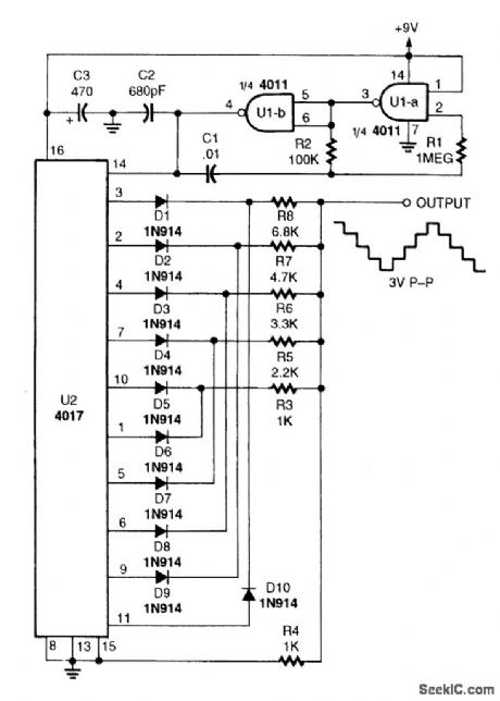 Two gates of a 4011 quad two-input NAND gate (U1) are connected in a pulse generator circuit.The square output at pin 4 of U1-b, connects to the clock input, pin 14, of a 4017 decade counter IC (U2). For each input clock pulse, the 4017 takes a single step. Because the 4017 counter is set up to count ten and then repeat the count, the stepped output frequency will only be Ho of the clock fre-quency. For a 100-Hz output, the clock generator must operate at 1 kHz.The 4017's positive output pulses begin at pin 3 and progress to pin 11 in a serial manner. The first output pulse, at pin 3, passes through Dl and R8 and appears across R4 to produce the first step up the triangle. The second pulse is routed through D2 and R7 to produce the second step. The out-puts at pins 10 and I form the top of the waveform and outputs at pins 5, 6, 9, and 11 produce the down steps. (View)