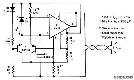 A logarithmic conversion is made on the output current of a photodiode to compress a fourdecade, light-intensity variation into a standard transmission range. The circuit is balanced at midrange, where R3 should be chosen so that the current through it equals the photodiode current. The log-conversion slope is temperature compensated with R6. Setting the reference output to 1.22 V gives a current through R2 that is proportional to absolute temperature because of D1 so that this level-shift voltage matches the temperature coefficient of R6. C1 has been added so that large-area photodiodes with high capacitance do not cause frequency instabilities. (View)