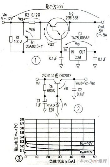 In the figure, resistor R1 provides bias current for the 3-terminal voltage stabilizer, and the need of R1<Veb2/Ib(max) must be met, if R1 is too high, the need in the above formula can't be met, the 3-terminal bias current is provided by base electricity of triode Tr2, and the output voltage is out of control.In figure 1, the output current of 0~5V is almost provided by Tr2, the power of Tr2 is large, so a radiator is needed.