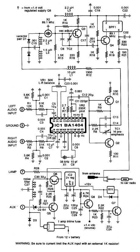 A BA1404 IC is used to generate a complete FM MPX signal. The chip contains all of the necessary circuitry. C1 and R3, and R4 and C4 provide pre-emphasis. The transmitter runs on a single AA cell. L3 is 3 tums of #20 wire on a 3/6 drill (for a form). L3 is1/4 long. L4 is 4 turns #20 wire on 3/6 drill bit, spaced to 3/8 . If monophonic operation is wanted, omit C5 and the 38-kHz oscillator components. (View)