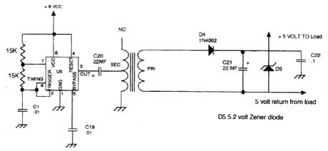 A NE555 timer is used to drive a small transformer to change the 5- to T-Vp-p output of the NE555 to a suitable value to drive a rectifier/Zener combination. This method is useful where a small isolated power source is needed. (View)