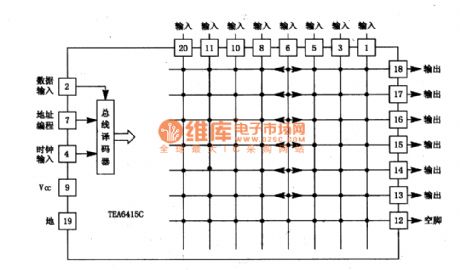 The video switch circuit of TEA6415C integrated circuithas eight input and six the output ends. The switch function of intergrated block is controlled by I (2) C bus.And the block diagram is shown as
