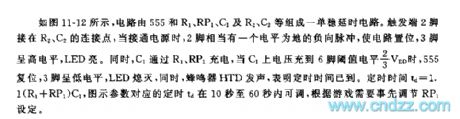 As shown in the figure 11-12, the monostable delay circuit is composed of 555 and R1, RP1, C1, R2, C2. the 2 foot of trigger terminal is connected to the joint point of R2, C2, when it is connected to power supply, the 2 foot has a negative pulse which the level is ground, it can set the circuit, the 3 foot is high level, LED turns on. At the same time, C1 is charged by R1, RP1, when C1's voltage is charged to 2/3 VDD of 6 foot's threshold value level, 555 is reset, the 3 foot is low level, LED turns off, buzzer HTD phonates, it shows that the timing time is reached. The timing time td=1.1(R1+RP1)C1. The td of indicative parameter is adjustable in the range of 10s~60s, it can be previously set according to the needs of game.
