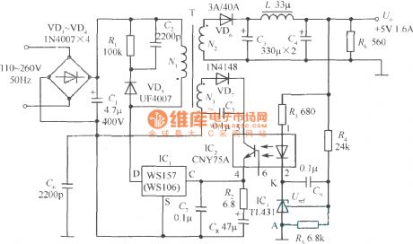 The +5V, 1.6A precision switching power supply circuit is as shown in the figure. This circuit increases the photoelectric coupler (CNY75A) and the adjustable precision parallel regulator (TIA31). R3 is the current limiting resistor, R4 and R5 are the sampling resistor. When the Vo changes, the sampling resistor will compare with the 2.5V reference voltage of the TL431, so the electric potential of the K port changes to change the LED's operating current and the luminous intensity of the CNY75, then it adjusts the control port current of WSl57 through the optocoupler, so you can fine-tune the duty cycle to realize the purpose of precision voltage. The CNY75A has also played the electrical isolation effect.