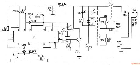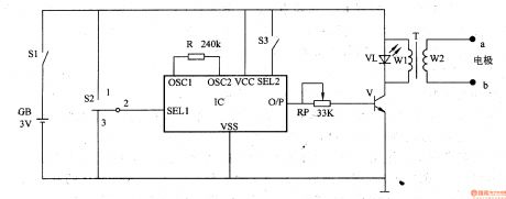 Sound generator circuit consists of sound IC IC, resistor R and the control switch S2, S3 components. Electrical pulse generating circuit by the potentiometer RP, transistor V, light-emitting diode VL, step-up transformer T and the electrode a, b.