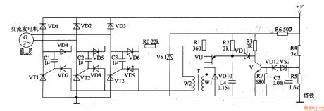 Three-phase alternating generator exports pulsating DC voltage +V. The voltage is adjusted by R4 and R5 and added to the negative pole of VS2. The voltage separates into two parts. One is limited by R6 and works as the working voltage of sampling detection control circuit and relaxation oscillator circuit. C4 is charging by R2. When the pressure over C4 reaches the highest value of VU, VU is transmitted. At this time C4 is discharging through VU. When the voltage over C4 is lower than a certain value, C4 begins to charge and discharge. The process repeats and the relaxation oscillator circuit is under the condition of oscillating. The rectifier exports current. (View)