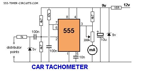 A 555 is configured as a monostable or one shot in this project. The period of the 555 is determined by the 47k and the capacitor from pin 6 to ground (100n). Time T = 1.1 RC or 1.1 X 50,000 X 0.1 X10 -6 = 0.0055 or 5.5 mS (milli-seconds). The 555 receives trigger pulses from the distributor points. These are limited by the 1k and 5v zener diode. These are AC coupled to the trigger input through the 100n coupling capacitor. The 50mA meter receives pulses of current through the 200k pot to show a reading.