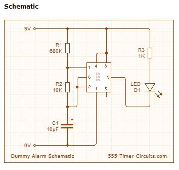 This Dummy Alarm project makes an LED flash briefly once every 5 seconds to imitate the indicator light of a real alarm. Overview The circuit is designed to use very little current to prolong battery life so that it can be left on permanently. An on/off switch is not included, but could be added if you wish. The 7555 timer IC used is a low power version of the standard 555 timer. A 憇uperbright?red LED is used because this provides a bright flash with a low current. The LED is off for most of the time so the average total current for the circuit is less than 0.2mA. With this very low current a set of 3 alkaline AA cells should last for several months, maybe as long as a year.