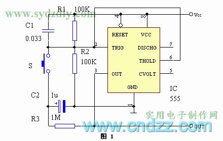 In figure 1 is the circuit. When the circuit gets power, C1 makes 6-pin of IC(555) acquire a positive pulse, the 3-pin is outputting a low LEV, at the moment, there is no voltage on C2. By pressing the key of S, the 0 LEV is working on 2-pin of the IC, 3-pin is reversed in a high LEV, C2 is charged by R3. After S is released, C2 is charged to Vcc, both the 2-pin and 6-pin are offset to 1/2Vcc by R1 and R2, the high LEV of 3-pin remains the same. By pressing S again, the voltage on C2 makes the voltage on 6-pin of the IC higher than 2/3Vcc, and 3-pin is reversed in a low LEV. (View)
