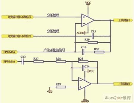 The input signal of the triangle wave producing circuit is from the EPWM1A's pin of the DSP, this signal is the PWM signal, it is integrated and changes into the triangle wave, then it is sent into the PWM producing circuit. The PWM signal which comes fron the TMS320F28335 is filtered by the second stage low-pass to produce the sine wave reference signal, this signal inverts with the inverter output voltage feedback signal. The PWM signal which is output by the pin of the EPWM2A is the city electricity input tracking signal, this circuit has the regulation function to the input sine wave signal. The figure shows the triangle wave and sine wave producing circuit.