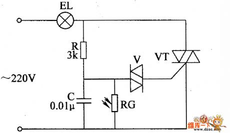 The optically controlled insects trap lamp circuit is composed of the bidirectional diode thyristor VT, two-way trigger diode V, photoresistor RC, resistor R, capacitor C, and light bulb EL, and the circuit is shown in the chart. R selects the 1W metal film resistor. RC uses MC45 series of photosensitive resistor, and it should be applied with a transparent rain cover. C selects the polyester capacitor or CBB capacitor with the voltage in 400V. V uses the DB3 or 2CTS2 two-way trigger diode. VT uses TLC336A (3A, 600V) bidirectional diode thyristor. EL uses 5 to 10 pieces of 40W, 220V incandescent bulbs conected in parallel, and the installation should add rain-proof glass shade, and lamp shade should be brushed a layer of black lacquer to enhance the effect of attracting insects.