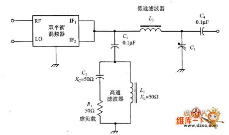 There are two tasks for duplex filter: ① to absorb unwanted mixer output signals so that they do not reflect back to the mixer; ② to send wanted signals to the output. In the figure, these two functions are achieved by two different LC networks. One is a high-pass filter and the other one is a low-pass filter. The assumption differential frequency signals in the circuit is what we need, so a high-pass filter (it’s half-power’s frequency is higher than the differential frequency) is used to guide frequency signals (that refers to the signal combination of RF and LC in the mixing process) to effective load R1. (View)