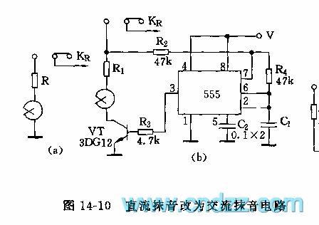 The general recorder uses the DC sound erasing mode, so the recording noise is large. Figure 14-10(a) is the DC sound erasing circuit. Figure(b) is the AC sound erasing circuit. The astable multivibrator is composed of the 555 and R4, C1, f=1.44/R4C1, the figure parameters' oscillation frequency is about 200Hz, the pin-3 outputs the driving amplifier to supply the sound erasing current to the sound erasing circuit.