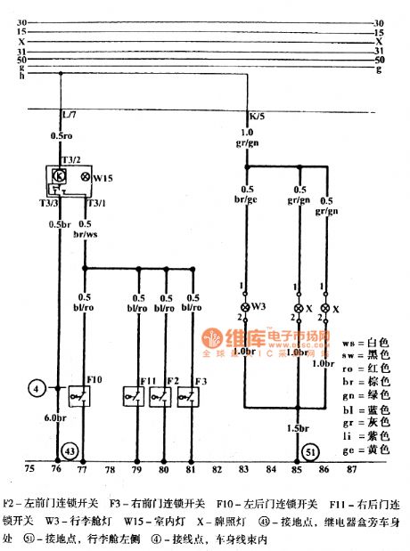 F2 - Left front door chain switchF3 - Right front door chain switchF10 - Left rear door chain switchF11 - Right rear door chain switchW3 - Luggage compartment lightW15 - Interior lightX - License plate lamp43 - Ground point, near the relay box next to the car body51 - Ground point, the left side of luggage compartment4 - Connection points, Within the body harness (View)
