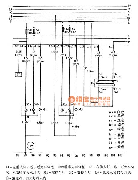 ws=whitesw=blackro=redbr=browngn=greenbl=bluegr=grayli=purplege=yellowL1-Left front headlight, Far, nearly two-lamp light, unchanged face automobile uses double filamentsL2-Right front headlight, Far, nearly two-lamp light, unchanged face automobile uses double filamentsM1-Left parking lightM3-Right parking lightE4-Varying light and turn signal switch119-Ground point, in the front headlight wire harness