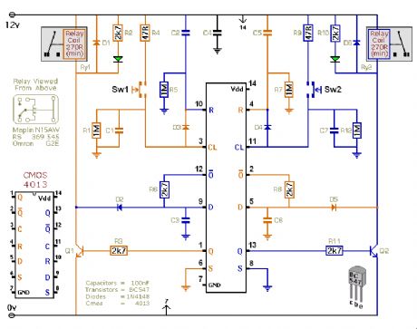 This versatile circuit provides a selection of different switching modes. It can be used as two entirely separate toggle switches - with each push button successively energizing and de-energizing its own relay. Or the two switches can be interlinked with diodes - to produce a number of different switching patterns. For example - the circuit can be used to reverse the direction of DC motors. (View)