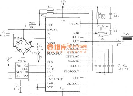 MAX1457 selects 93C66 4096b external read-only memory E2PROM. MCS-end is pulled into a high level after geting power, and it selects the main chip. +5V power supplyprovides partial pressurefor the bias circuit by the resistor RBIAS (400k). C2, C4 and C6 are the decoupling capacitors. C1, C3, C5, C7~C11are bypass capacitors. When you take RISRC=50k Ω, excitation current is 0. 5mA.