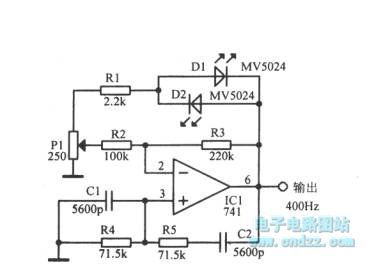 Published:2014/5/4 19:46:00 Author:lynne | Keyword: Using light emitting diode and the operational amplifier 400Hz sine wave circuit diagram, 741