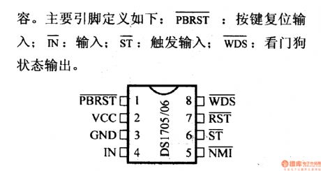 The DS1705/DS1706 monitorThe working voltage is 3.3V/5.0V; it has the halt and restart failure micro-processor; it can restart the micro-processor automatically after the computer fault is gone; it has the external overload monitor key; the 3.3V system can exactly monitor the resetting of 5%VCC, 10%VCC and 20%VCC; the 5.0V can monitor the resetting of 5%VCC or 10%VCC. The working temperature range is -40~85℃; the is compatible with MAX705/MAX706 completely. The definitions of its main pins are as follows: PBRST: input by pressing the reset key; IN: input; ST: triggering input.