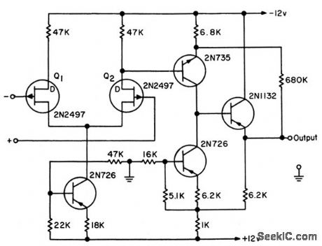 Gives maximum voltage gain of 60 db, constant within 0.5 db from -55 to +125℃ with built-in gain adjustment. Has good low-frequency response, along with extremely low noise, as little as 5 db at 10 cps. Used with low-level transducers, null detectors, recorders, oscilloscopes, and medical research equipment.-Texas Instruments Inc., Solid-State Communications, McGraw-Hill, N.Y., 1966, p 293. (View)