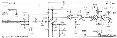 Q1-Q2 amplify negative analog samples greater than 100 mv, to provide sharp pulse output for driving monostable mvbr in analog-digital converter.-N, Aron and C, Granger, Analog-To-Digital Converter Uses Transfluxors Electronics, 35:20, p 62-66. (View)