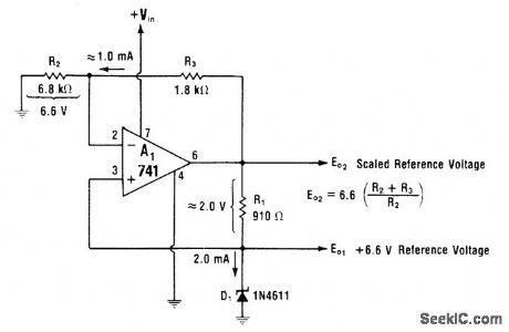 Uses combination of negative and positive feedback to maintain constant current of 2 mA in D1, independent of variations in ambient temperature and unregulated input. Reference voltage of 6.6V, determined by breakdown voltage of 1N4611 zener, is scaled up to more positive level at output of A1. Scaled output has low impedance and can supply appreciable current without affecting reference voltage accuracy. Supply must be single-ended for reliable starting.-W. G. Jung, IC 0p-Amp Cookbook, Howard W. Sams, Indianapolis, IN, 1974, p 141-143. (View)
