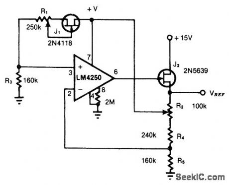 Uses JFET biased slightly below pinchoff in combination with micropower opamp to convert zero-temperature-coefficient drain current to correspondingly stable reference voltage. Additional JFET J2 makes operation independent of value of unregulated input. Output impedance is low. For higher output impedance, reference voltage can be taken from wiper of R2, but buffering could then be required. R1, is adjusted to compensate for temperature coefficient arising from opamp supply current.-N. Sevastopoulos and J. Mayer, Micropower Reference Stays Stable, EDN Magazine, Sept. 5, 1978, p 158. (View)
