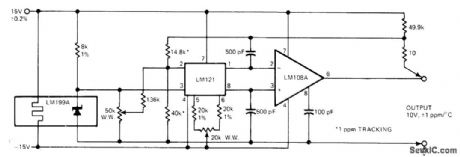 Suitable for A/D converter applications in which output voltage can drift as much as 20 PPM/℃. Temperature-drift error is divided equally between zener and amplifier, permitting use of moderately low-drift components.-R. C. Dobkin, Don't Forget Reference Stability When Designing A-to-D Converters, EDN Magazine, June 20, 1977, p 105-108. (View)