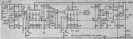 Uses miniature gas-filled decade counters that provide visual indication of count along with high reliability. Schmitt-trigger input feeds mono between counter tubes. Can produce output after desired count if counter is initially reset to complement of the desired number.-K. Apel and P. Berweger, Miniature Gas-Filled Tubes For High-Speed Counting. Electronics. 33:8,p46-47. (View)