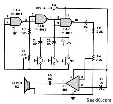 The heart of the trombone is R3, a slide potentiometer. Two gates of a quad two-input NAND gate, IC1-a and IC1-b, make up a simple audio-oscillator circuit, with R1, R3, C1, C2, and C3 setting the oscillator's frequency:The oscillator's output is buffered by IC1-c, which also supplies the drive signal for the power amplifier, IC2. The trombone's output level is set by R4. A slide handle, made of plastic or wood, should be attached to the slider of R3. The complete circuit, enclosed in a small plastic cabinet, with the three push-button switches, S1 to S3, mounted in a convenient location for playing. Just press one or more of the tone-control switches, S1 to S3, and work the slide. (View)